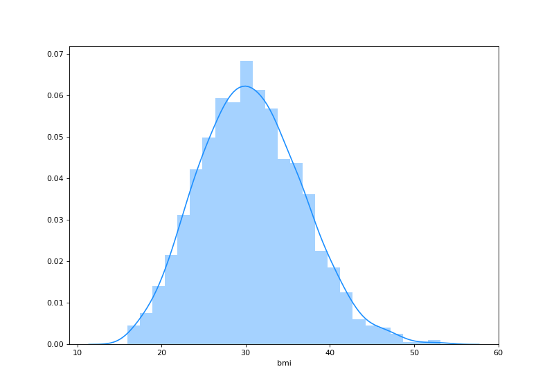 Vamos supor que trabalhamos em uma companhia de seguros de vida e precisamos, por algum motivo, realizar alguns procedimentos utilizando este conjunto de dados. Estamos interessados em saber se a distribuição dos dados na coluna “bmi” é normal. Ou seja, queremos saber se o índice de massa corporal dos pacientes segue distribuição normal.